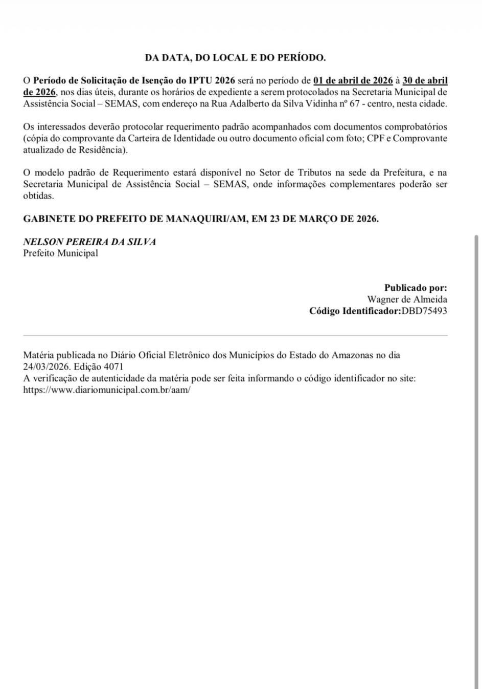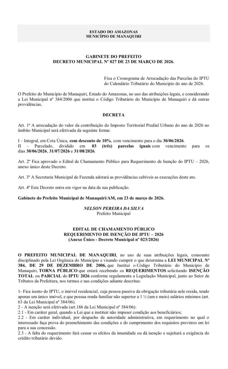 Está aberto o período para solicitação de isenção do IPTU 2026 em Manaquiri.